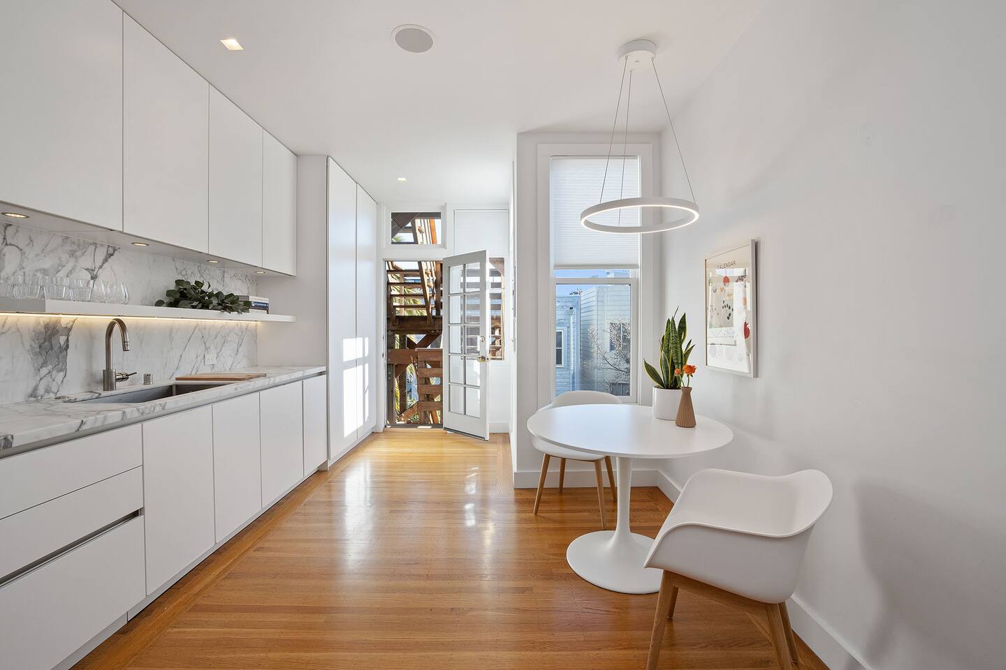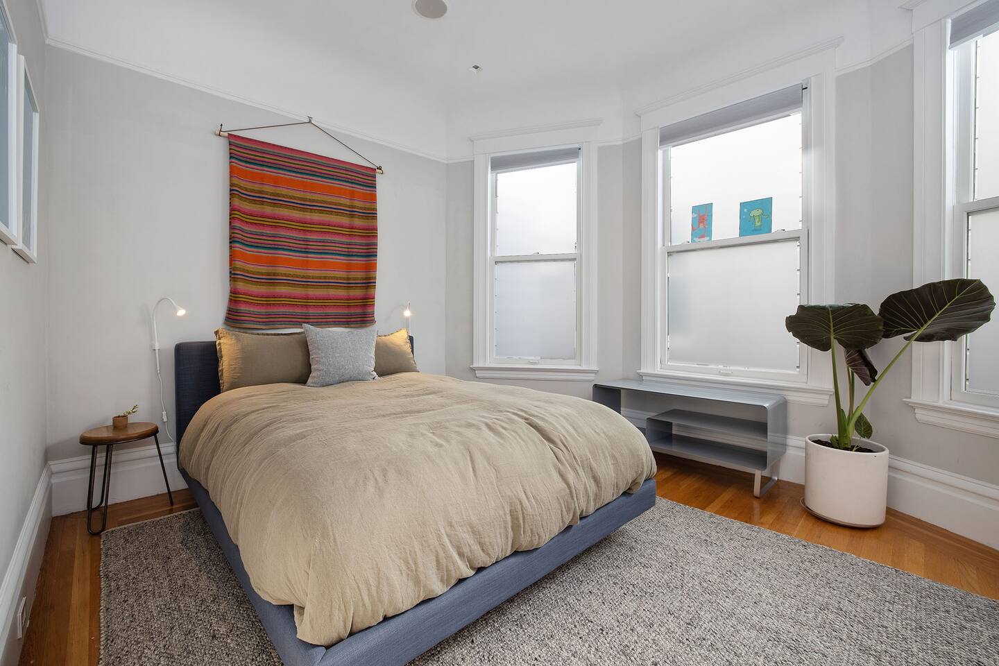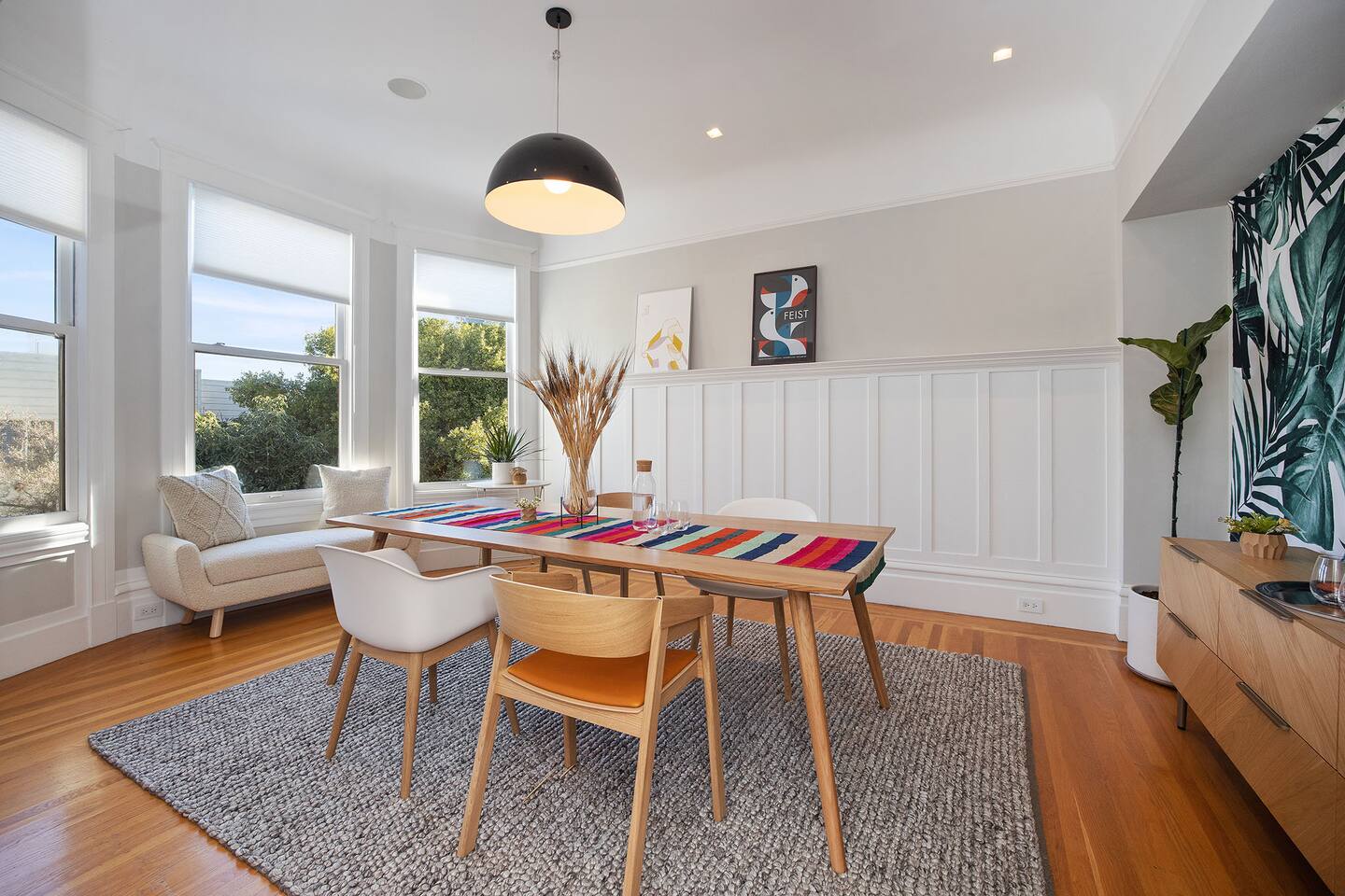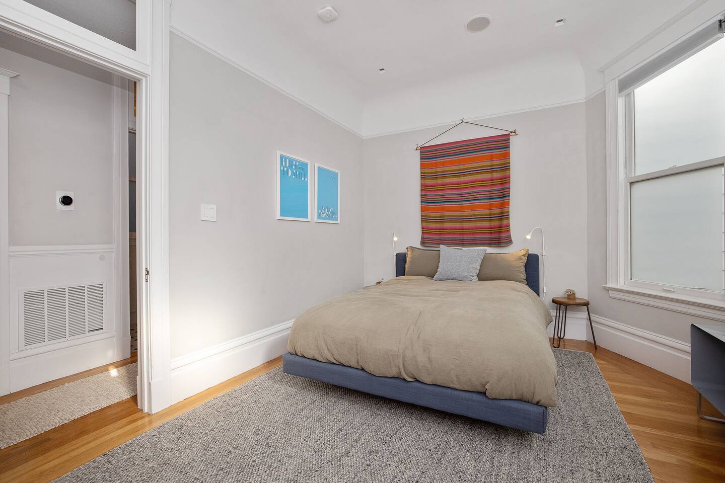 Dine at home with our local dining delivery recommendations or prepare your own in the chef's kitchen of floating shelves, marble slab counter and backsplash, large stainless-steel refrigerator, stainless steel range and oven with hood, and a dishwasher. Bi-Rite Market is around the corner on 18th Street for inspiration. Listen to music and podcasts on 8-inch in-ceiling stereo pair speakers in each of six rooms — three bedrooms, living room, dining room and kitchen — via the Sonos app on your smartphone. Brighten or dim each room's architectural pendants and flush lights via the Lutron app on your smartphone. Soothe in the verdant backyard with raised deck, BBQ grill, deck couch and chairs, dining table, and native plant landscaping. Marvel at the Edwardian-era building finishes including cove ceilings, crown molding, and wainscoting.