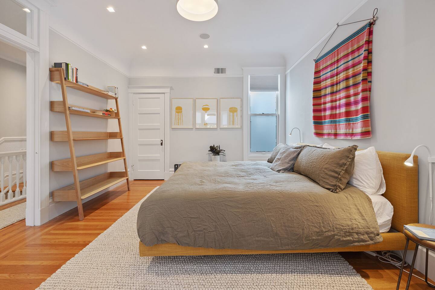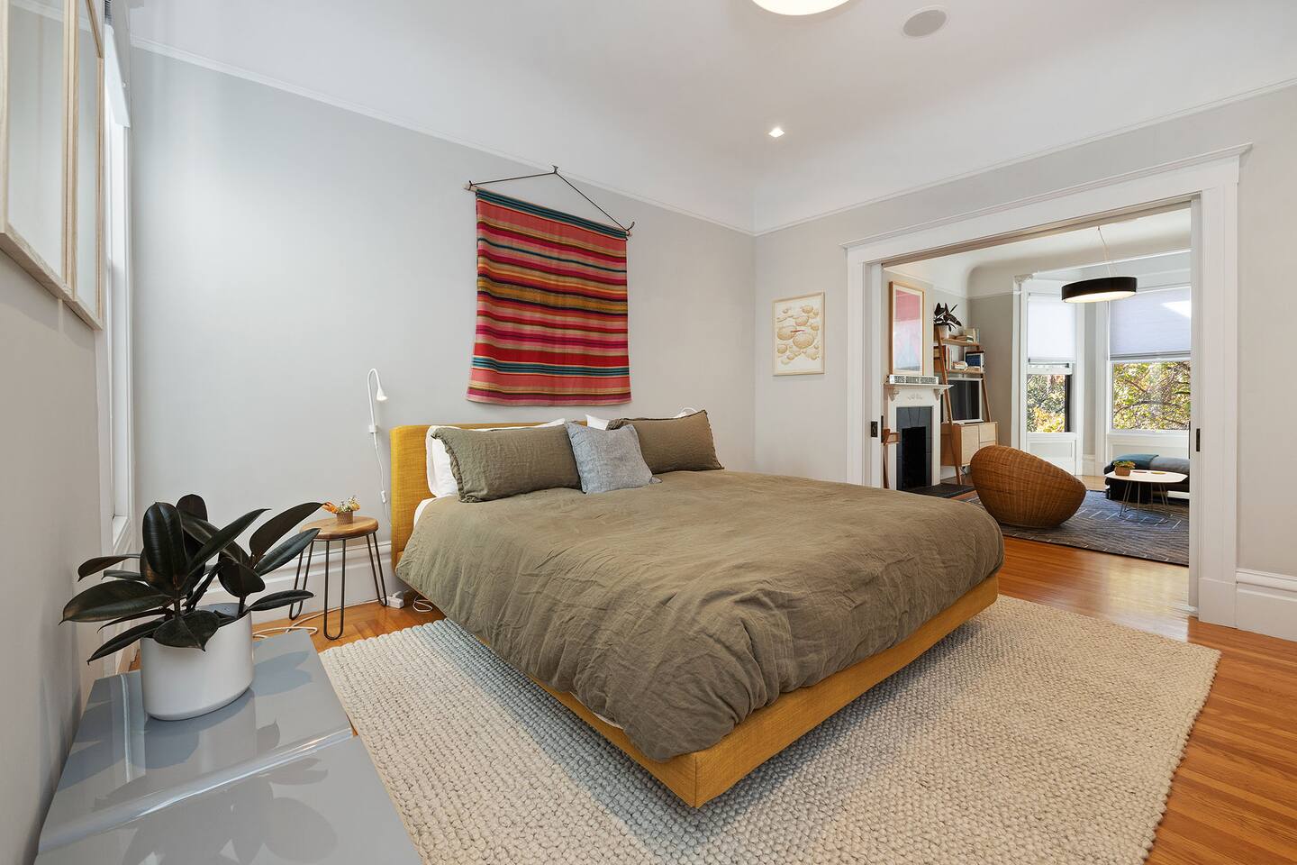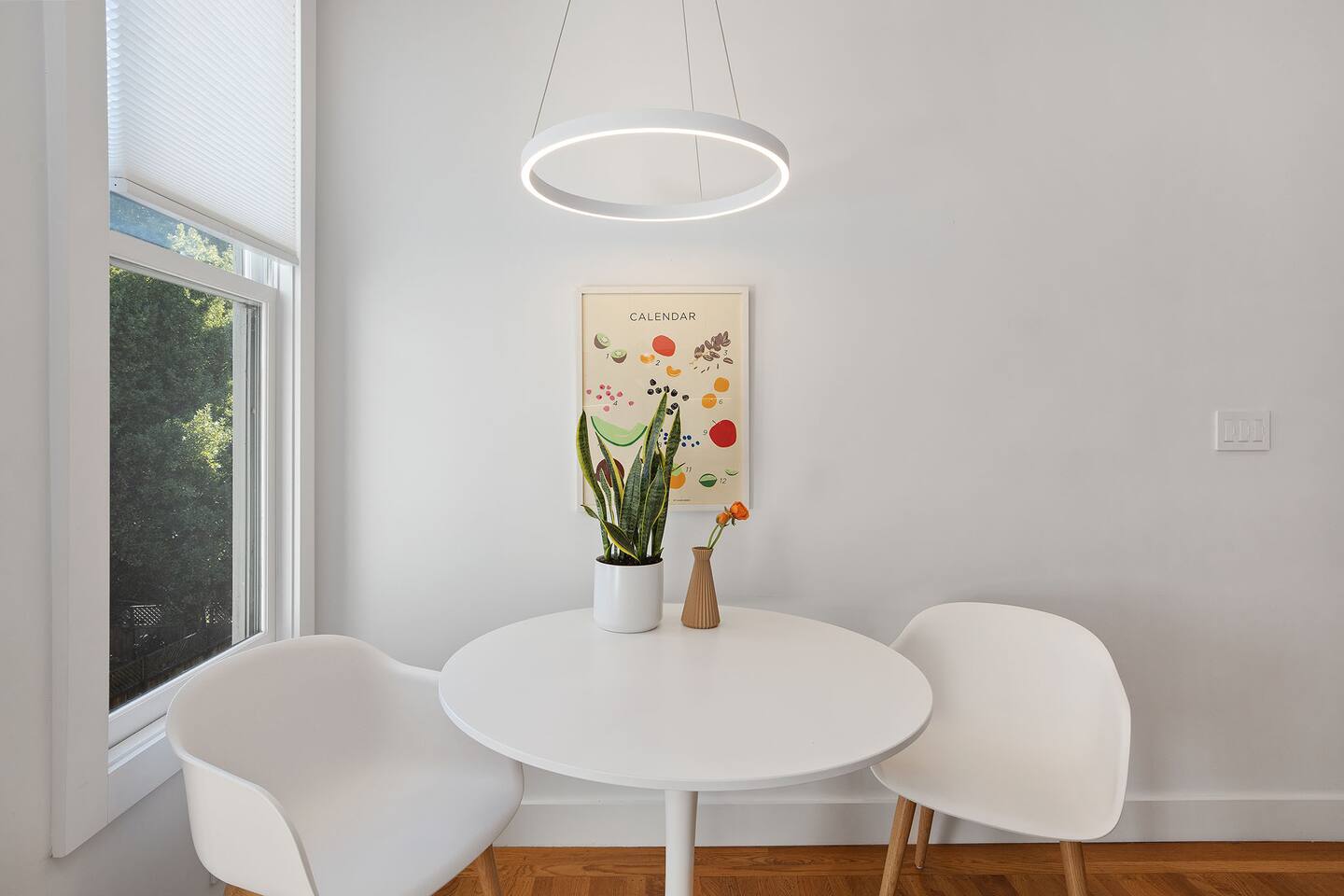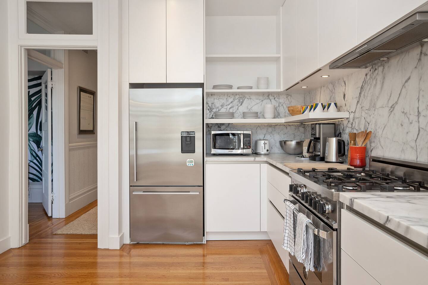 Dine at home with our local dining delivery recommendations or prepare your own in the chef's kitchen of floating shelves, marble slab counter and backsplash, large stainless-steel refrigerator, stainless steel range and oven with hood, and a dishwasher. Bi-Rite Market is around the corner on 18th Street for inspiration. Listen to music and podcasts on 8-inch in-ceiling stereo pair speakers in each of six rooms — three bedrooms, living room, dining room and kitchen — via the Sonos app on your smartphone. Brighten or dim each room's architectural pendants and flush lights via the Lutron app on your smartphone. Soothe in the verdant backyard with raised deck, BBQ grill, deck couch and chairs, dining table, and native plant landscaping. Marvel at the Edwardian-era building finishes including cove ceilings, crown molding, and wainscoting.