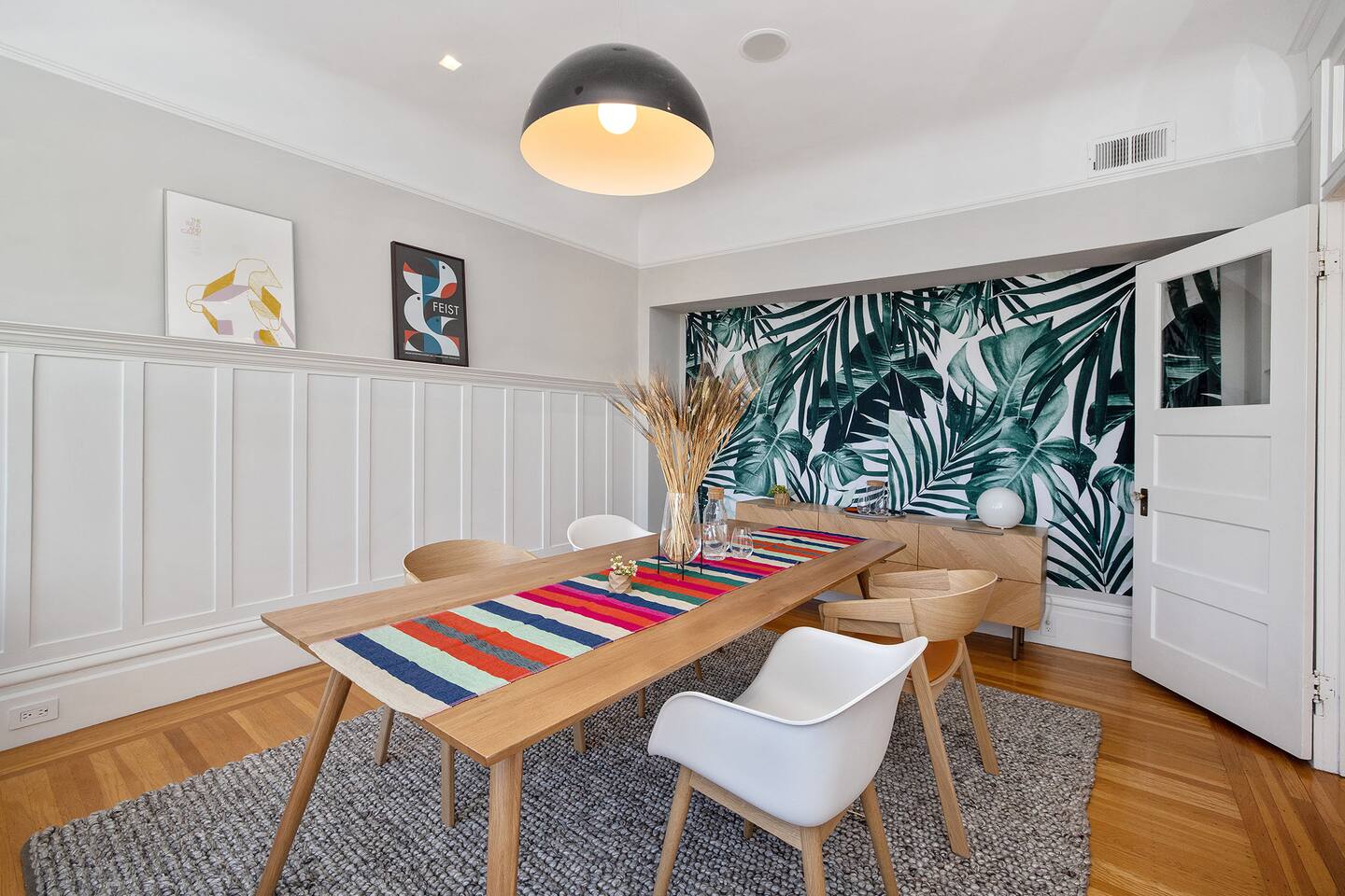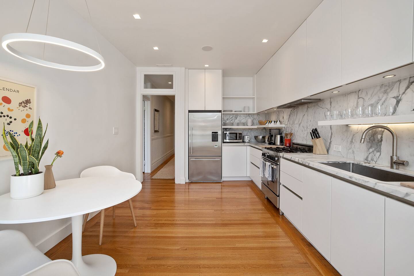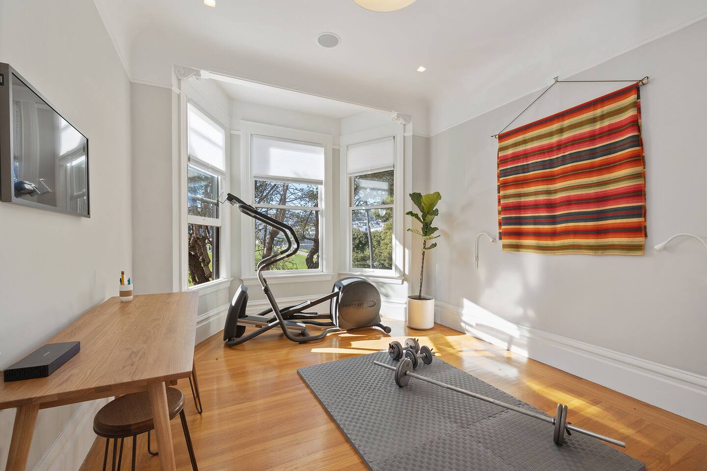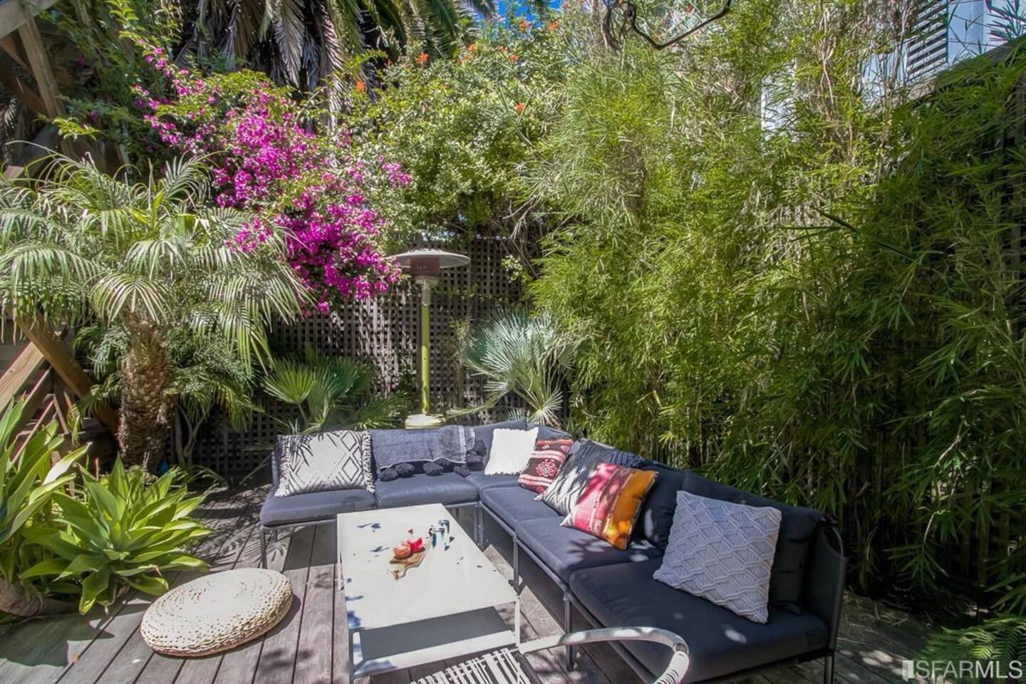 Dine at home with our local dining delivery recommendations or prepare your own in the chef's kitchen of floating shelves, marble slab counter and backsplash, large stainless-steel refrigerator, stainless steel range and oven with hood, and a dishwasher. Bi-Rite Market is around the corner on 18th Street for inspiration. Listen to music and podcasts on 8-inch in-ceiling stereo pair speakers in each of six rooms — three bedrooms, living room, dining room and kitchen — via the Sonos app on your smartphone. Brighten or dim each room's architectural pendants and flush lights via the Lutron app on your smartphone. Soothe in the verdant backyard with raised deck, BBQ grill, deck couch and chairs, dining table, and native plant landscaping. Marvel at the Edwardian-era building finishes including cove ceilings, crown molding, and wainscoting.
