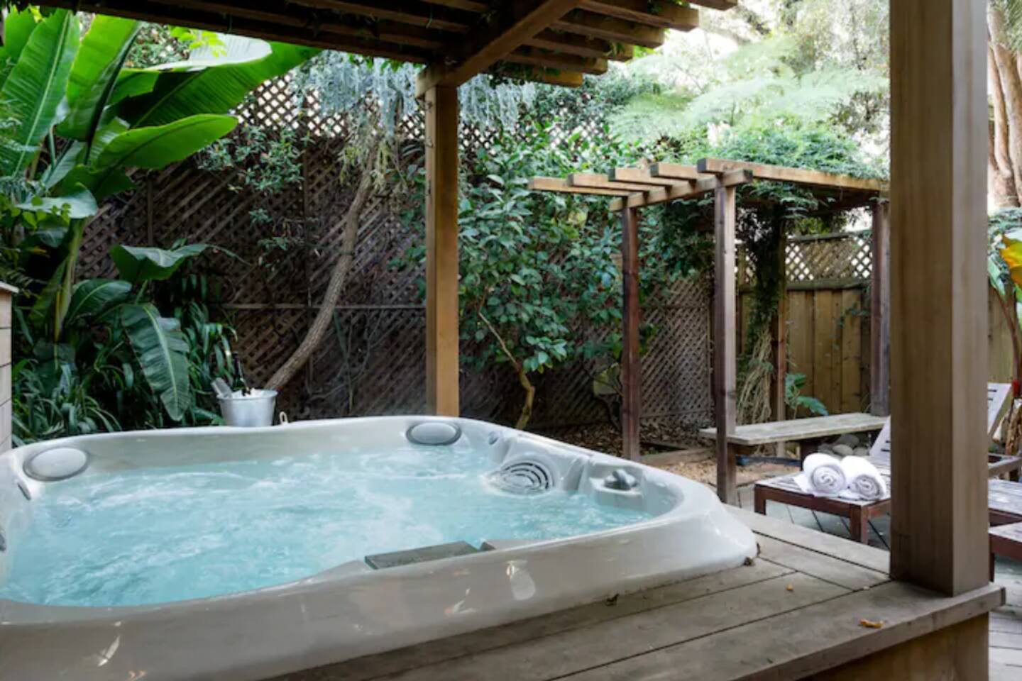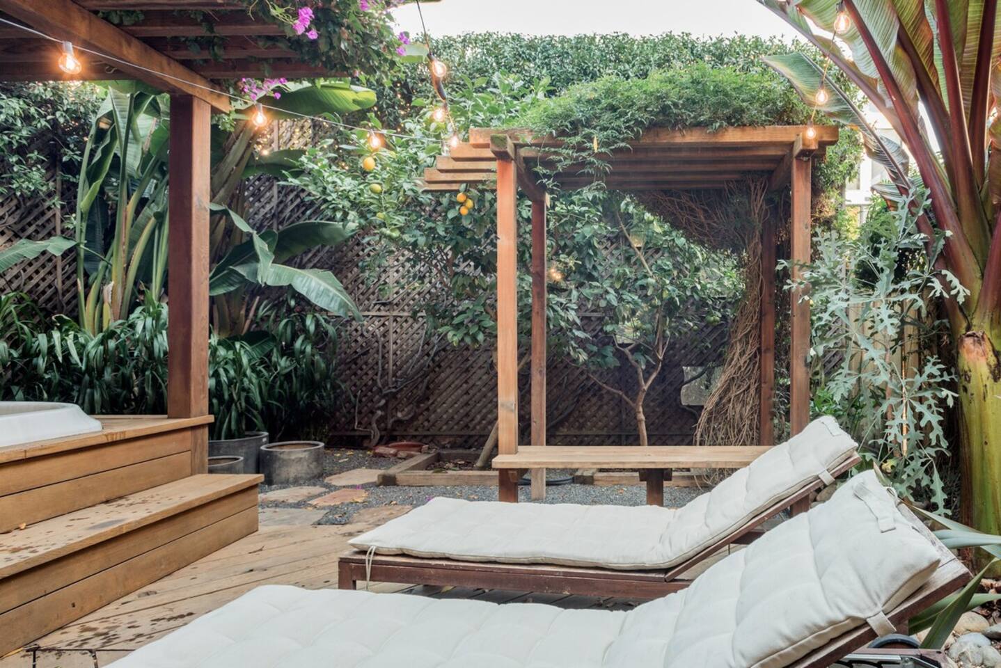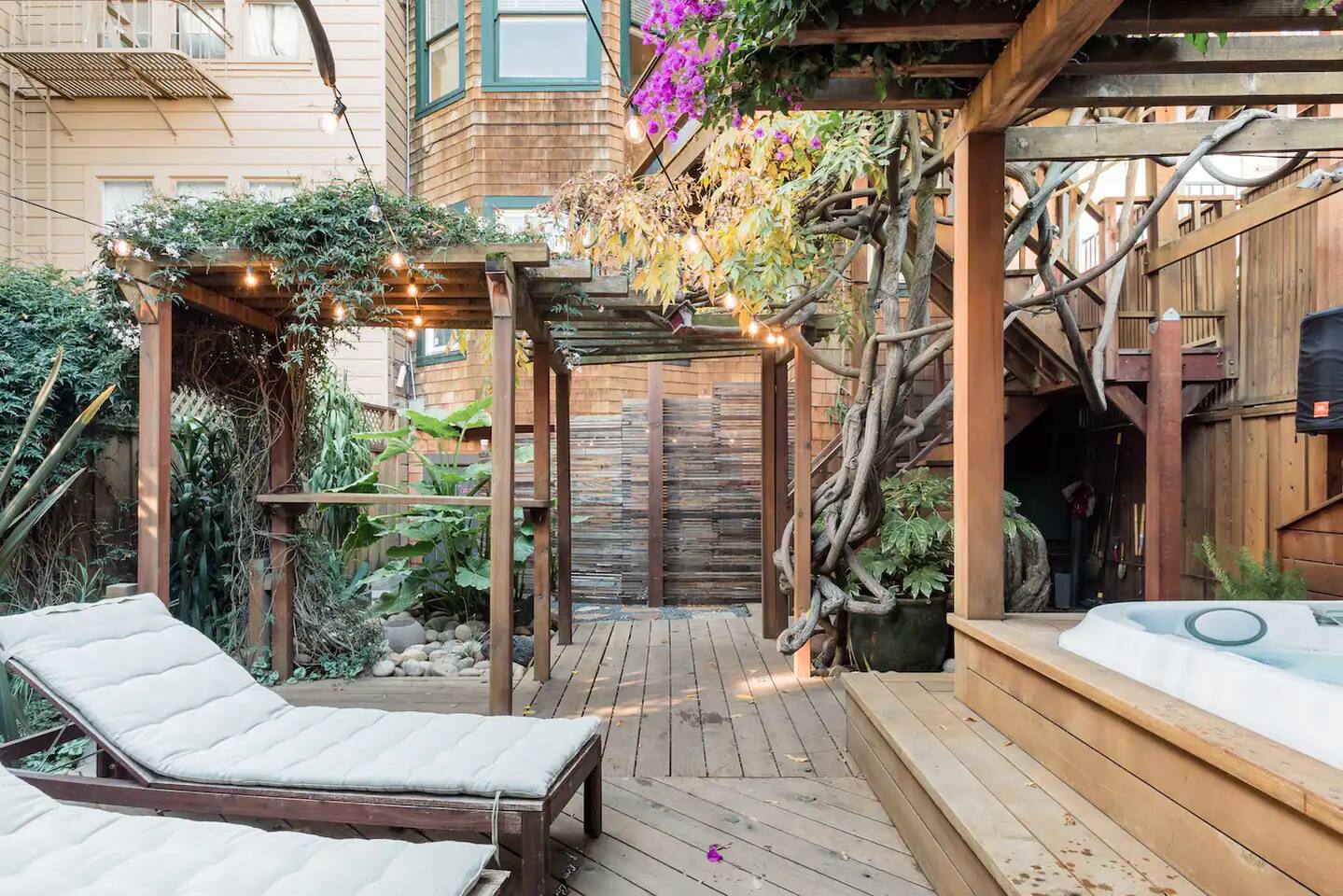 · Superfast Gigabit WiFi ‧ Full-Service Cleaning ‧ Relax in this warm cabana with a private hot tub, one bedroom, full bathroom, deluxe kitchenette, and living room with full-height glass lanai doors opening to a private garden patio and verdant backyard with chaise lounges. Stroll to Noe Valley, Castro, and Valencia neighborhoods. Easy access to MUNI, BART, Waymo/Uber/Lyft, car rental, and bike rental transportation options.